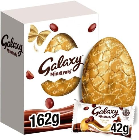 Hollow Egg: Hollow milk chocolate egg. Galaxy Minstrels: Milk chocolate (75%) in a sugar shell.